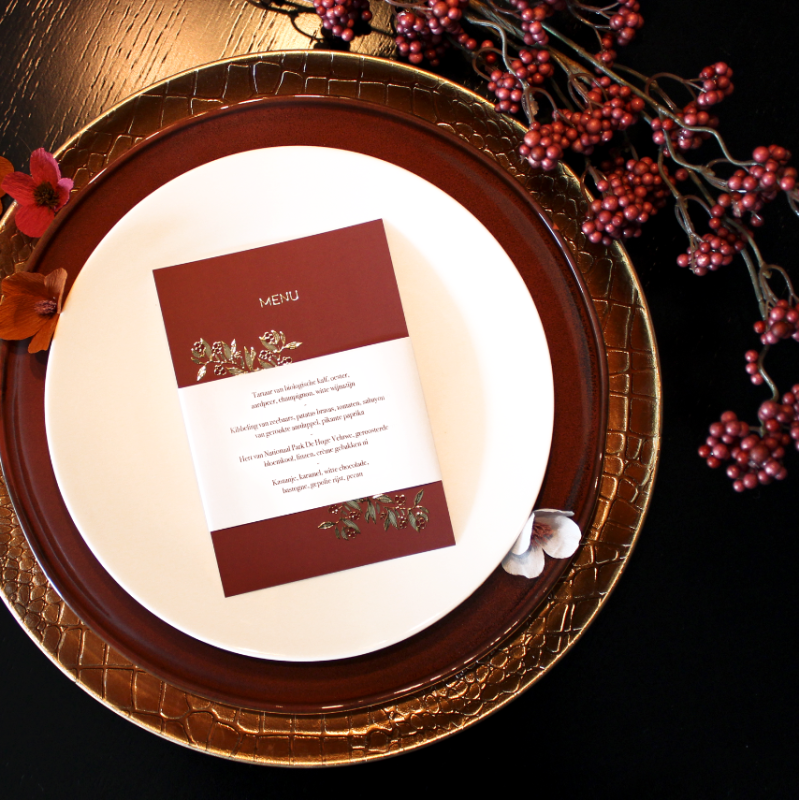 Waarschijnlijk geen grote gezelschappen dit jaar met kerst. Maar alle ruimte om de kerst uitgebreid in een kleine setting te vieren. Ga voor een mooie tafelaankleding met deze mooie menukaart. en bijpassend naamkaartje.